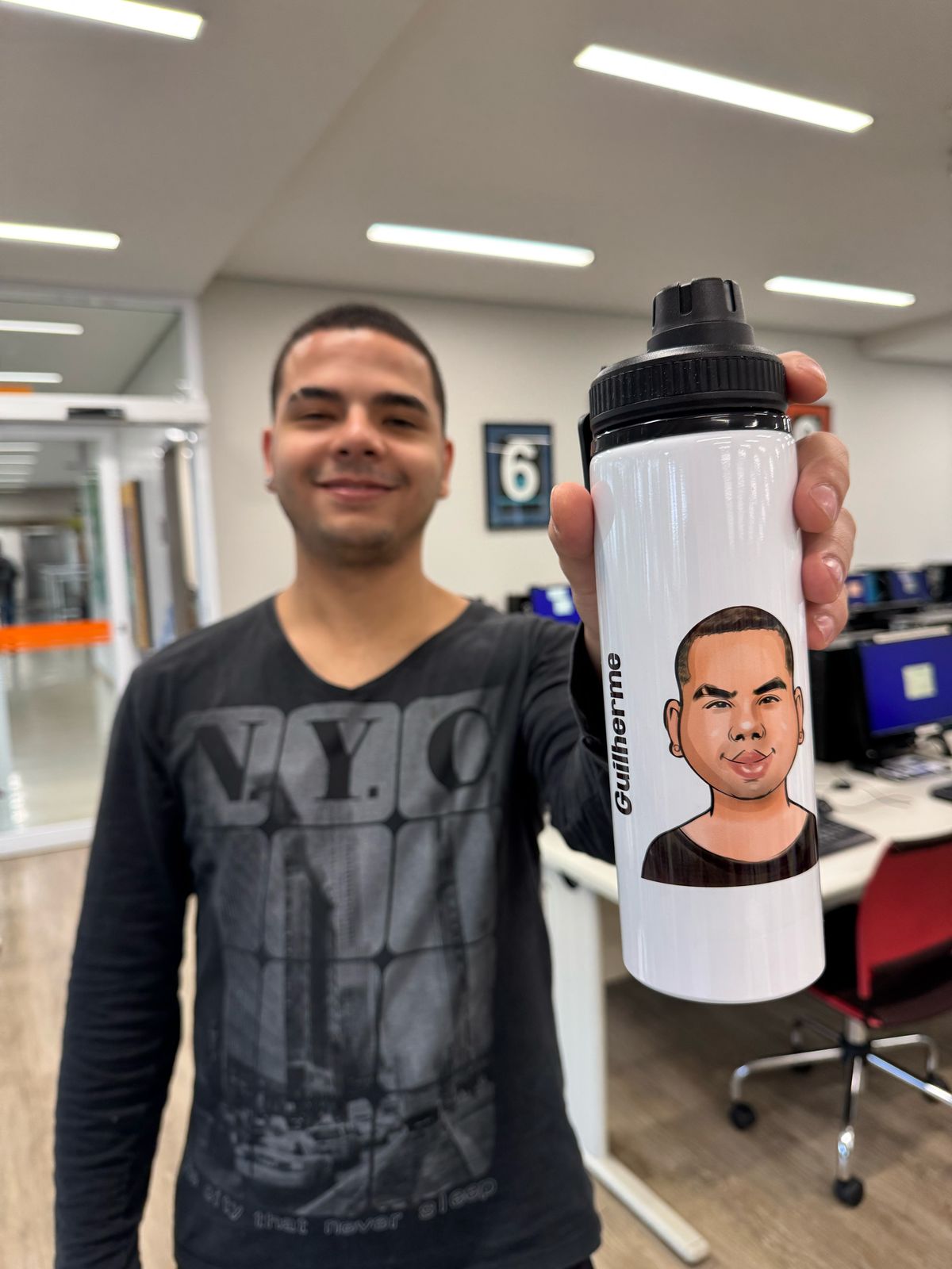Caricatura em squeeze de alumínio é uma alternativa para que os colaboradores não usem mais copos plásticos na empresa para tomar água.